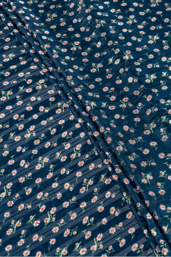 Italiensk polyesterchiffon af devore-arten i marineblå med motiv af små blomster (eng). Devore-stoffet er en kombination af chiffon med yderligere satinstriber. Stoffet er tyndt, gennemsigtigt, ikke-elastisk, meget delikat. Perfekt til syning af en luftig bluse, nederdel, kjole eller sjal.