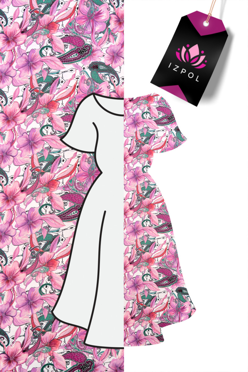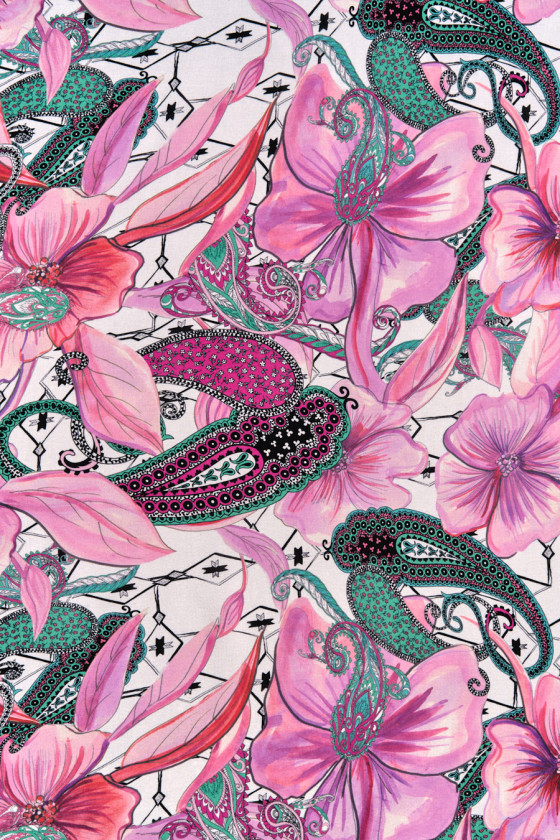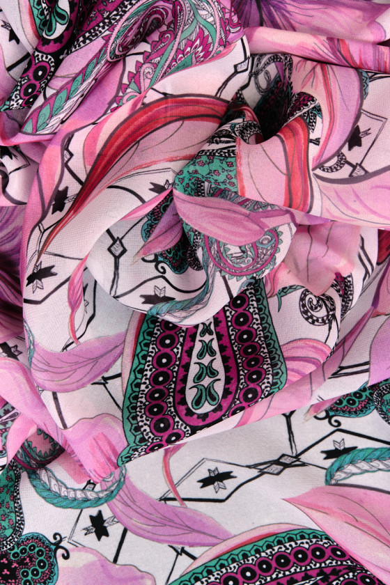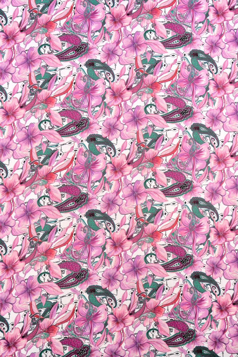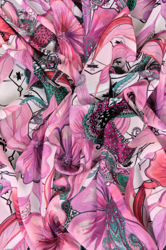 Italiensk cremefarvet polyesterchiffon med et tæt motiv af store, lilla-lyserøde blomster. Det hele er omgivet af orientalske paisleymotiver i grøn, lyserød og sort og små sorte pile. Stoffet er tyndt og flydende, så det er perfekt til at sy en sommerkjole eller bluse. Et fantastisk forslag til fans af orientalske motiver i forårsfarver.
