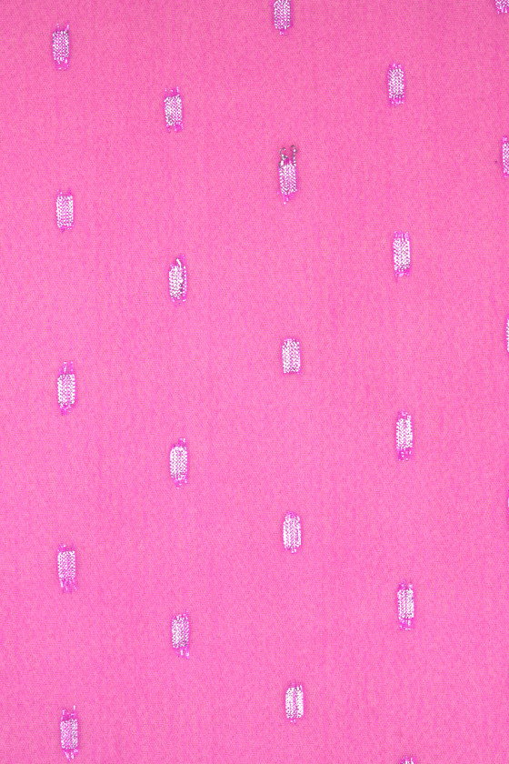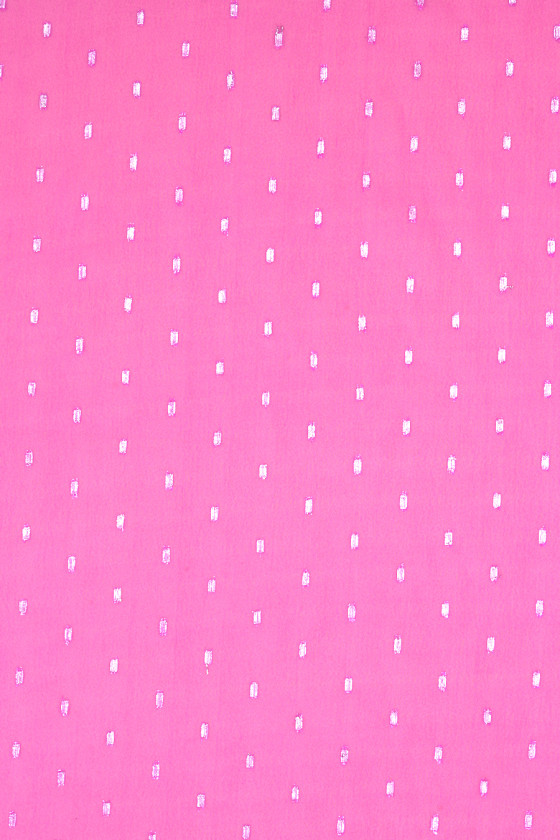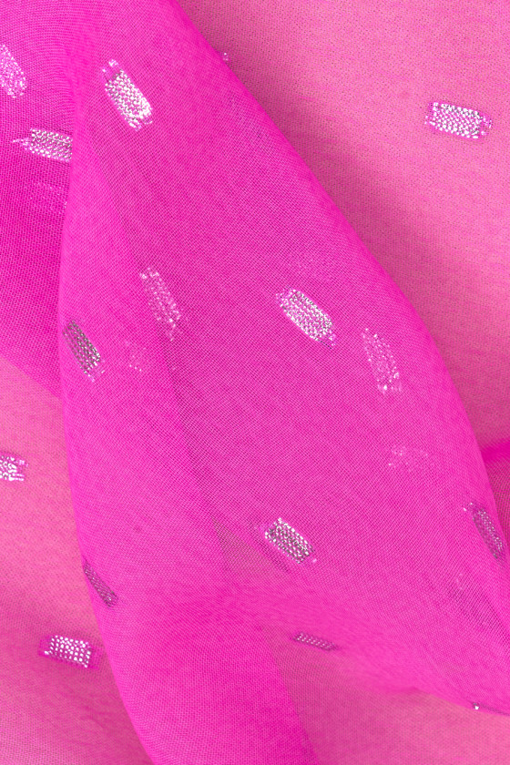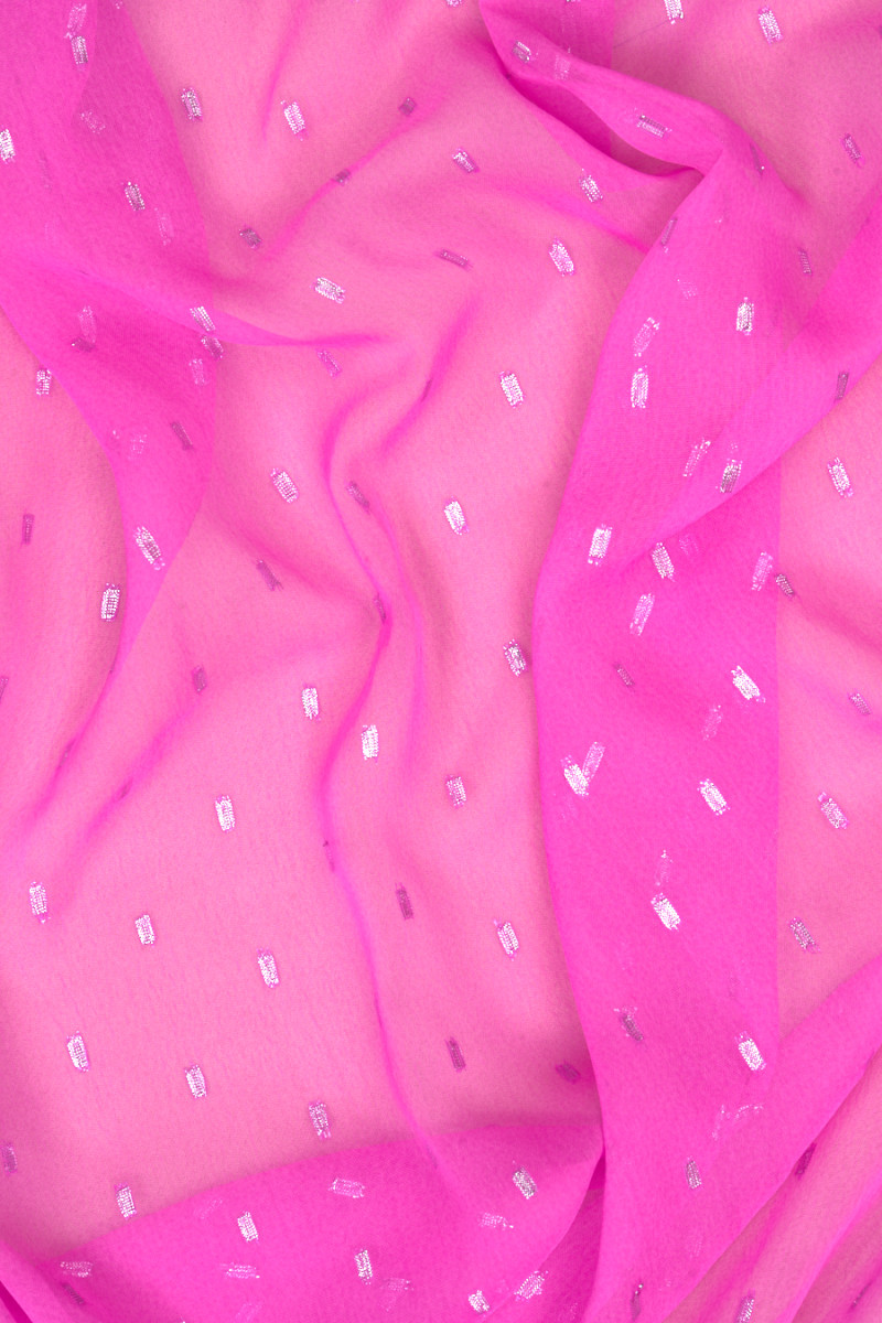 Italiensk polyesterchiffon i hot pink med et motiv af små, geometriske mønstre lavet af sølv lurex tråd. Stoffet er tyndt og flydende, så det er perfekt til syning af en luftig kjole, bluse eller sjal. Et fantastisk forslag til fans af energiske, let skinnende stoffer.