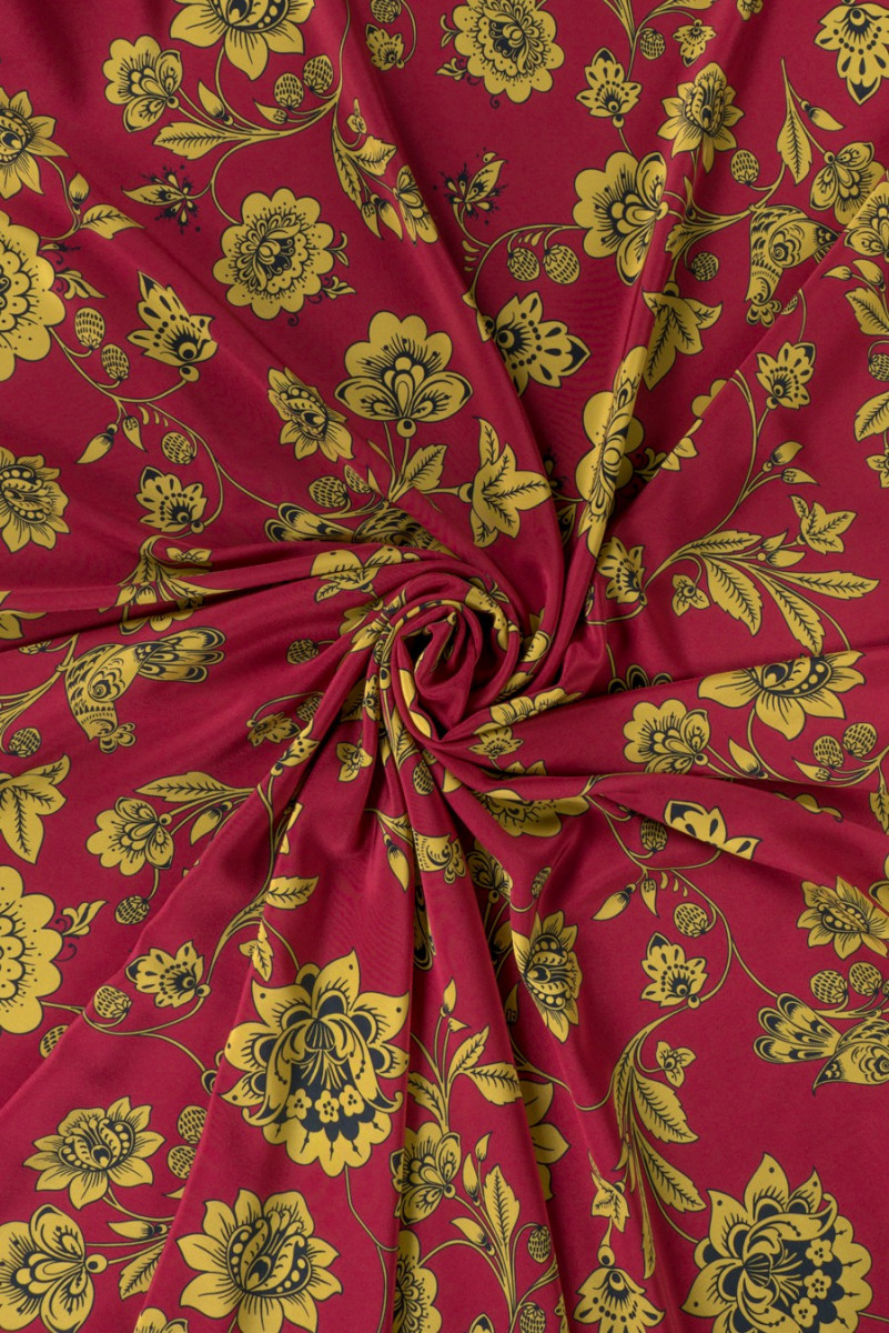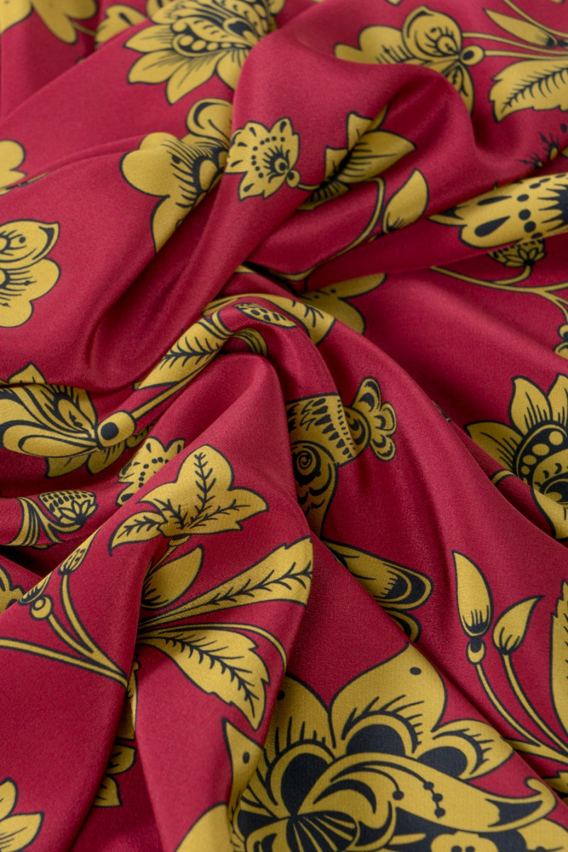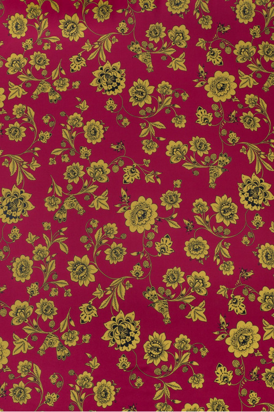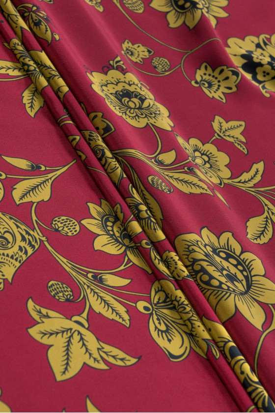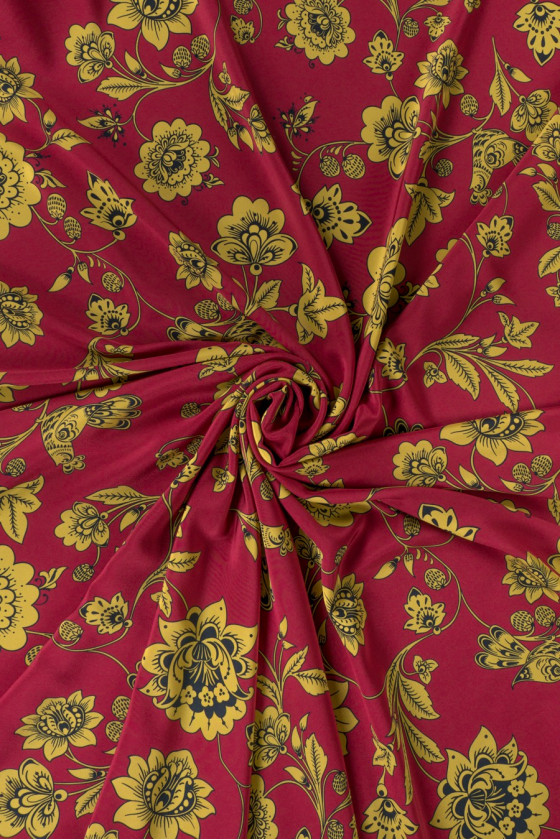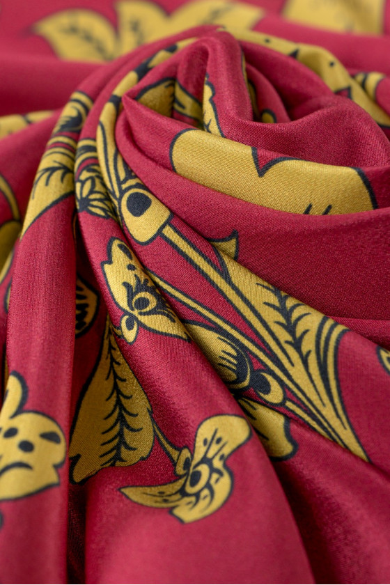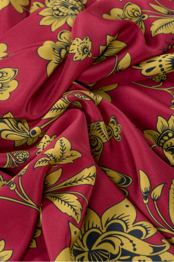 Silkecrepe signeret af en kendt modedesigner i lys bordeaux med blomsterprint i gul kiwi med sort. Silkecrepe er et delikat, tyndt, men uigennemsigtigt, halvmat stof. Det kan bruges til at fremtrylle luftige kjoler, sarte bluser, tørklæder, tørklæder.