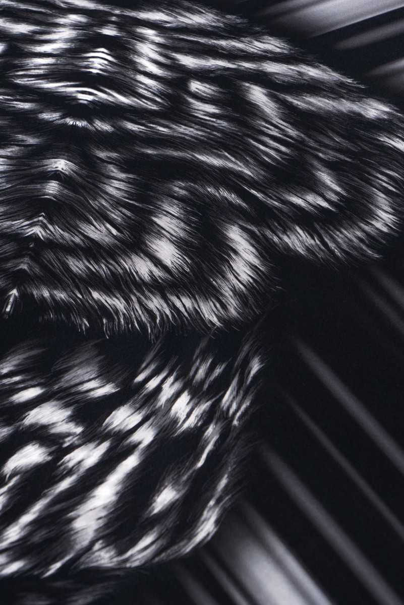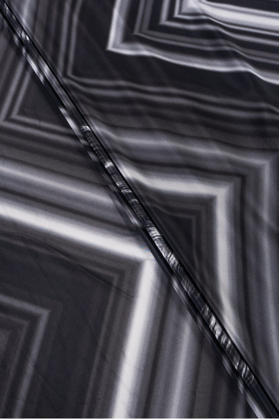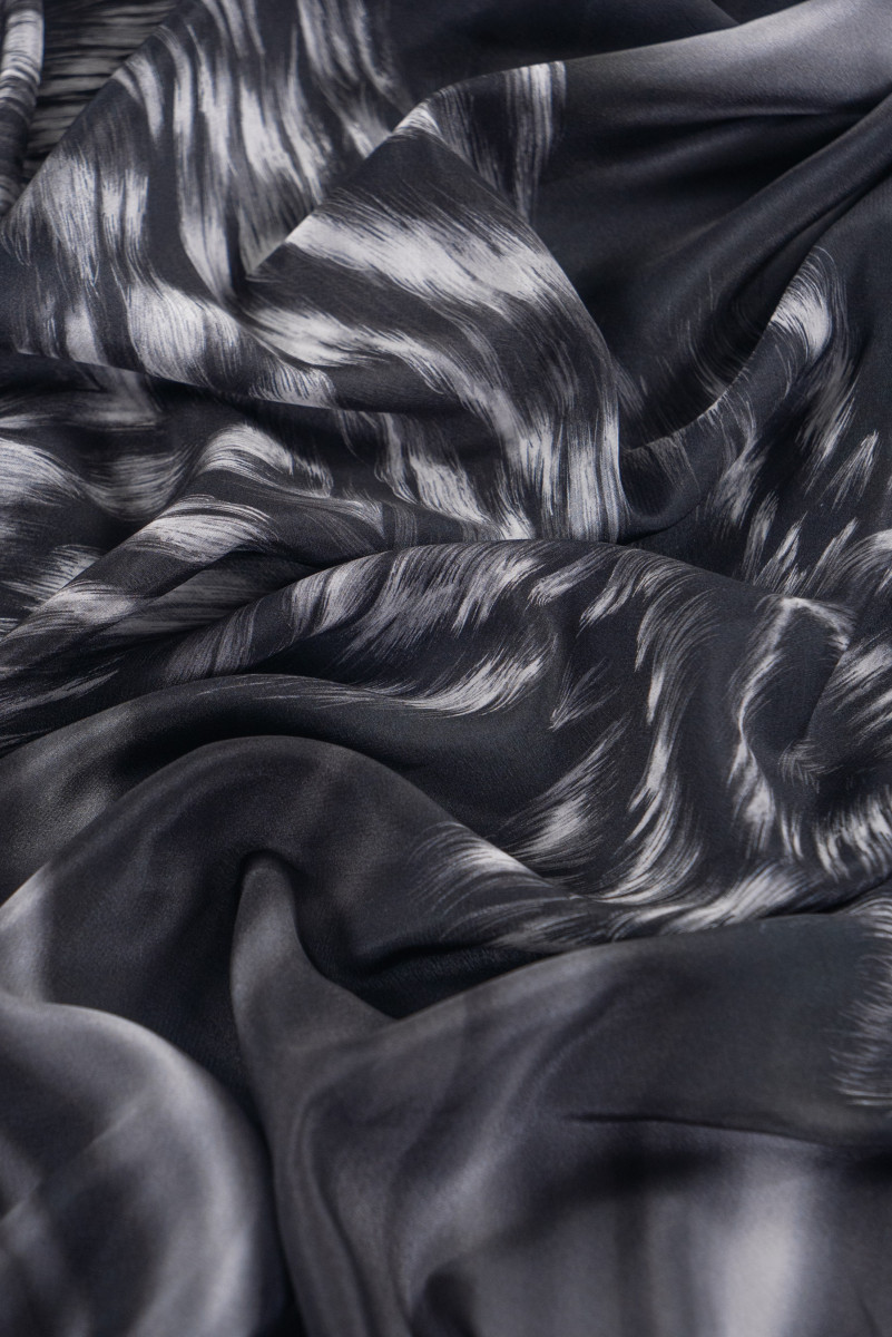 Italiensk 100% silkecrepe i kuponstørrelse 125 cm* 140 cm. Stof med originalt motiv i grå og sort. Silkecrepe er et delikat, tyndt, halvmat stof. Det kan bruges til at fremtrylle luftige kjoler, sarte bluser, tørklæder, tørklæder.