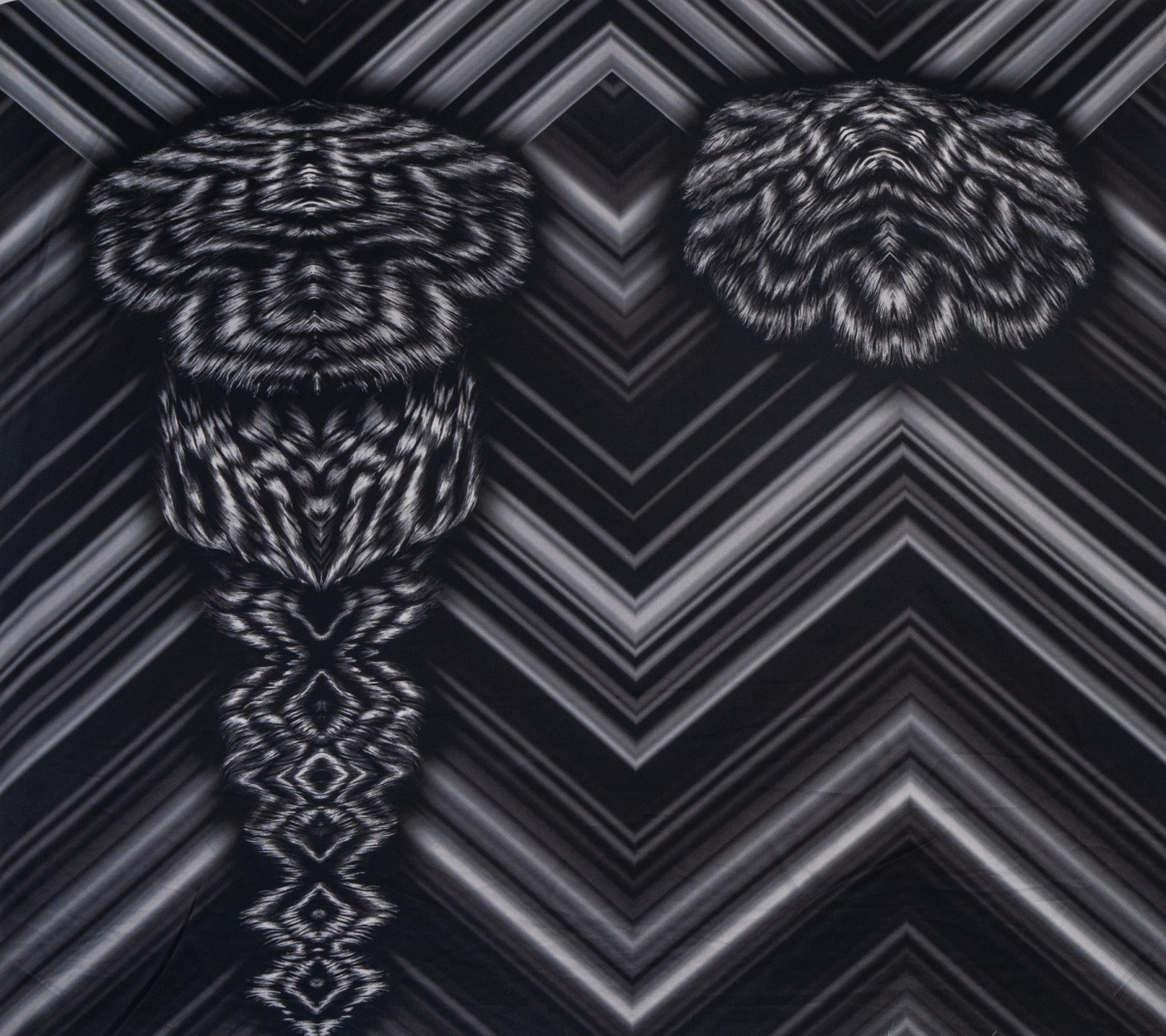 Italiensk 100% silkecrepe i kuponstørrelse 125 cm* 140 cm. Stof med originalt motiv i grå og sort. Silkecrepe er et delikat, tyndt, halvmat stof.