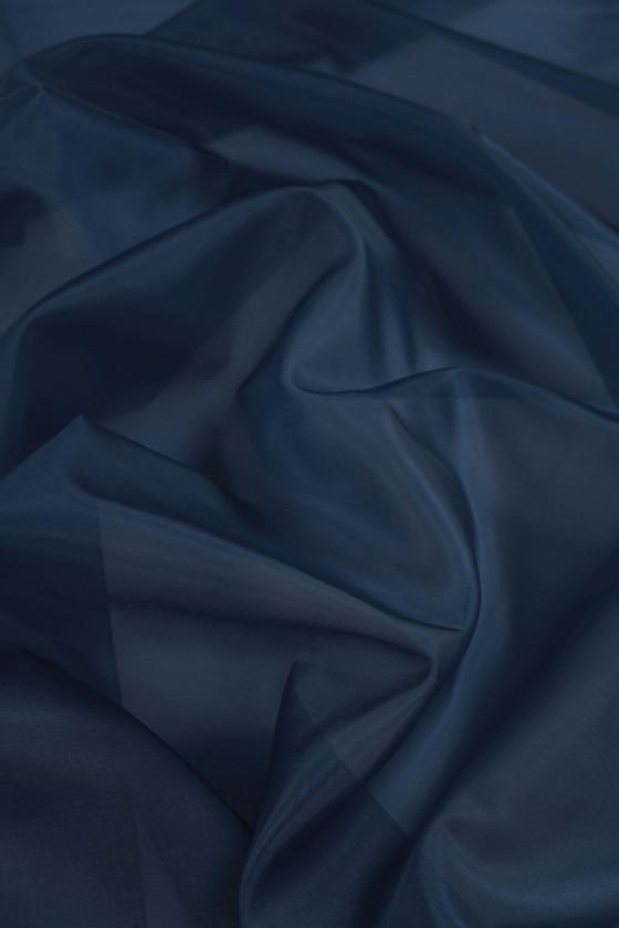 Italiensk 100% silke organza stof i mørk marineblå. Naturlig silkeorganza er et tyndt, gennemsigtigt, men stift stof med en delikat glans, der er karakteristisk for silkestoffer. Perfekt til syning af kjole, bluse, skjorte, nederdel.
