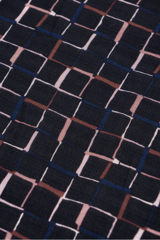 Italiensk 100% silkeorganza stof i sort med firkantet motiv (3 cm). Tykkere stof med en interessant mesh vævning. Naturlig silkeorganza er et stift stof med en delikat glans, der er karakteristisk for silkestoffer. Perfekt til syning af en kjole, bluse, skjorte, nederdel.