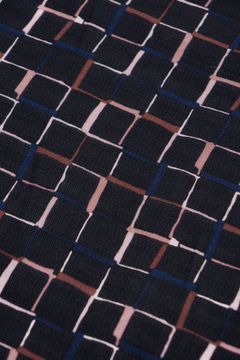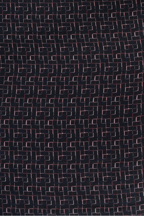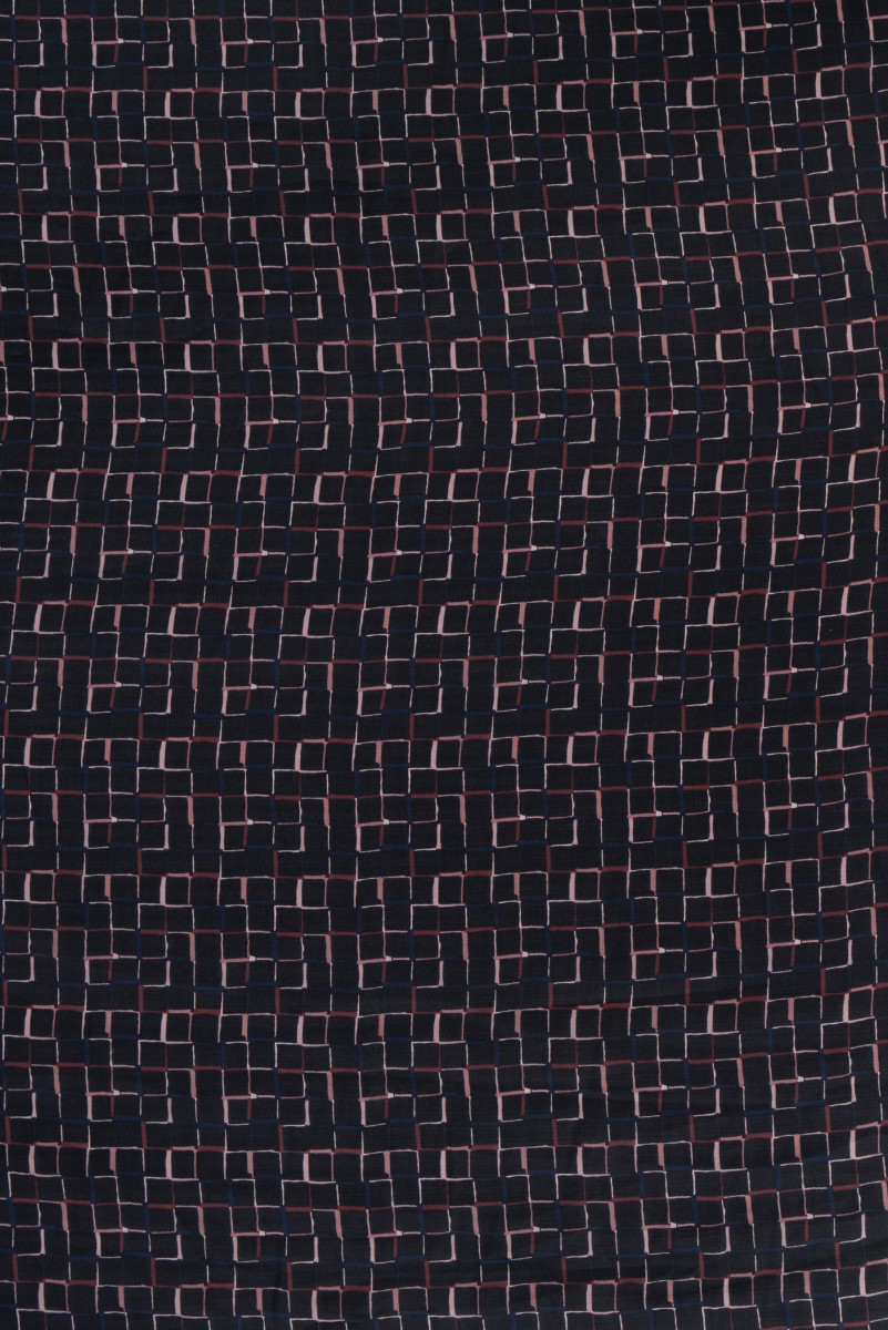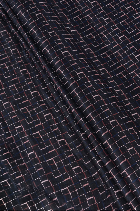 Italiensk 100% silkeorganza stof i sort med firkantet motiv (3 cm). Tykkere stof med en interessant maskevævning, lidt gennemsigtig.