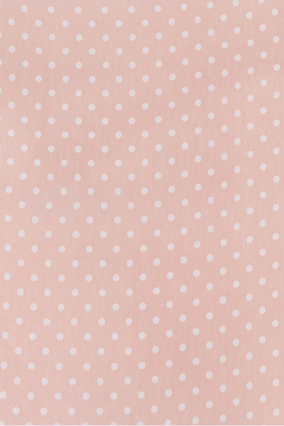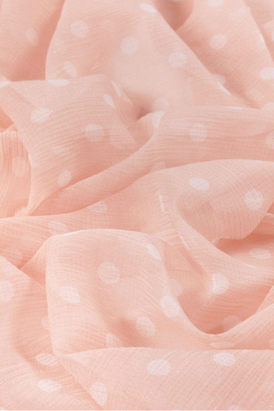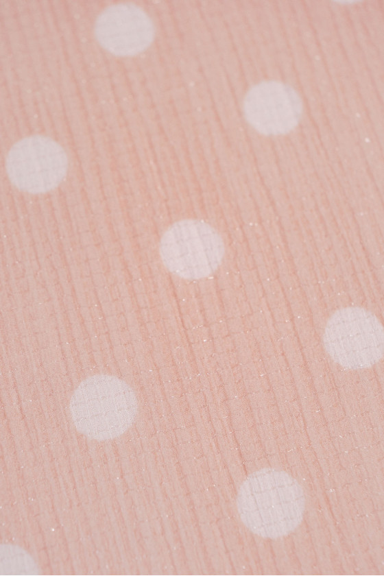 Italiensk chiffon 100% silke med en krøllet (krøllet) struktur i lyserød med hvide prikker. Stoffet er desuden dekoreret med en sølv lurex tråd. Chiffon lavet af naturlig silke er et meget delikat, luftigt og gennemsigtigt stof. Perfekt til luftige kjoler og bluser. Let elastisk stof.