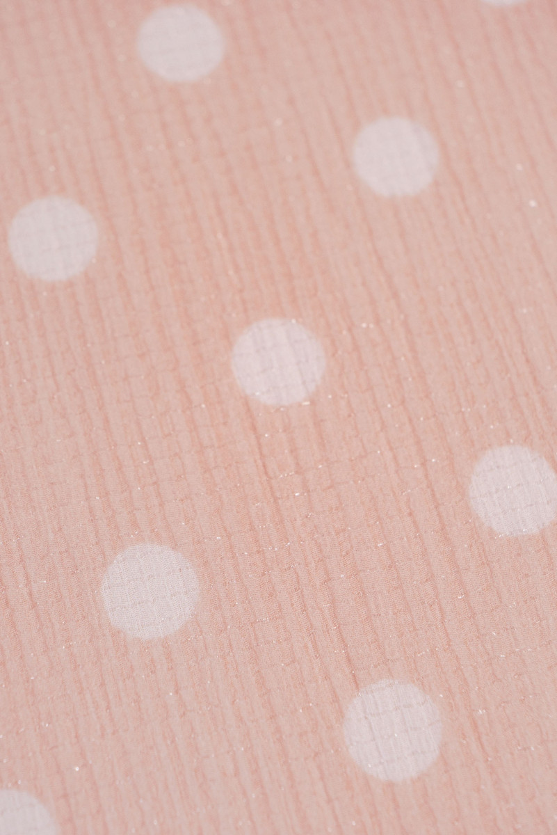 Italiensk chiffon 100% silke med en krøllet (krøllet) struktur i lyserød med hvide prikker. Stoffet er desuden dekoreret med en sølv lurex tråd.