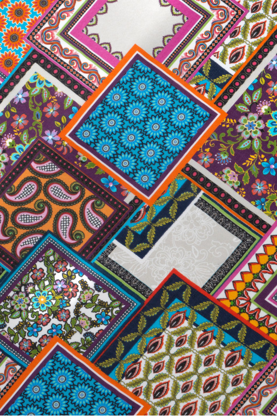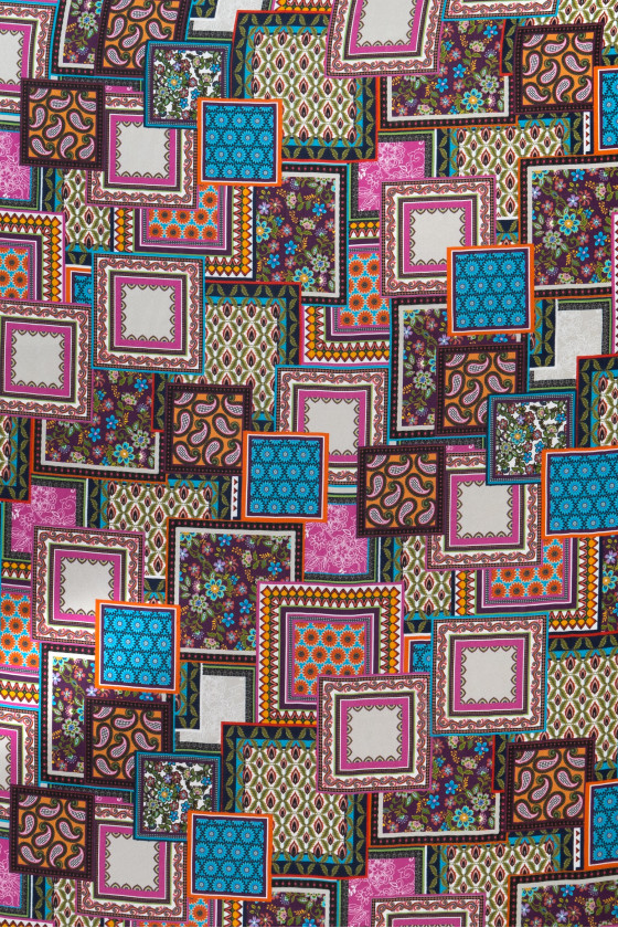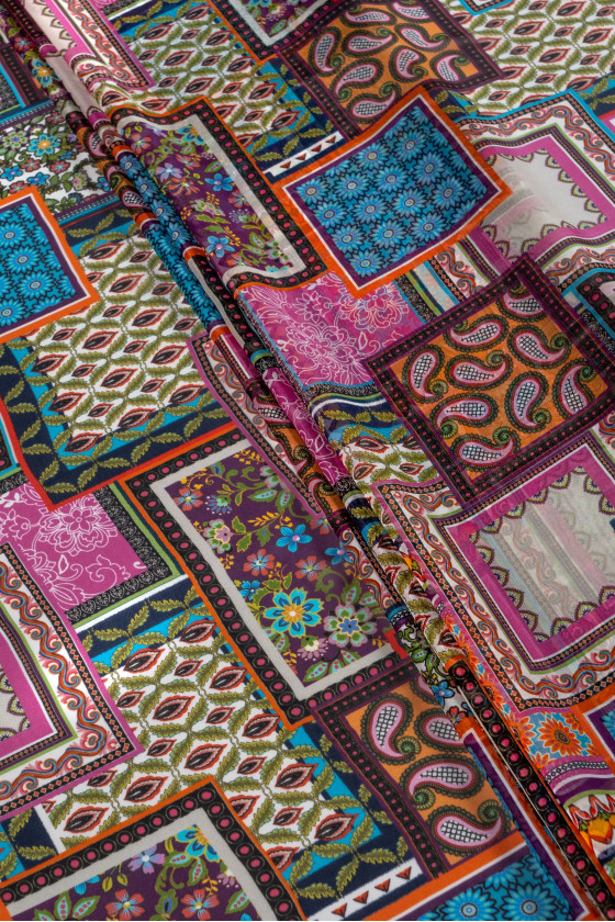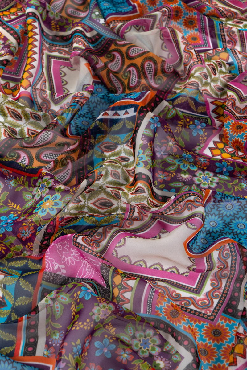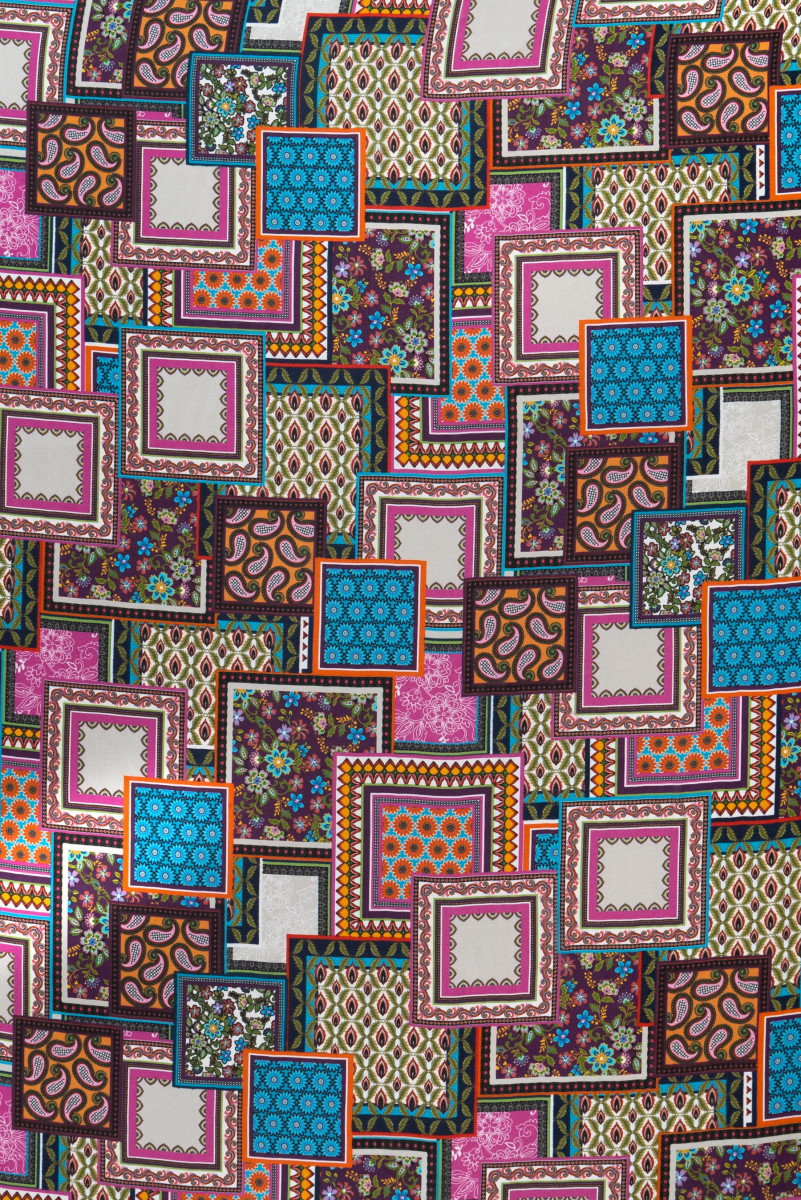 Italiensk chiffon 100% silke med et motiv af farverige firkanter - patchwork. Chiffon lavet af naturlig silke er et meget delikat, luftigt, gennemsigtigt, mat stof.