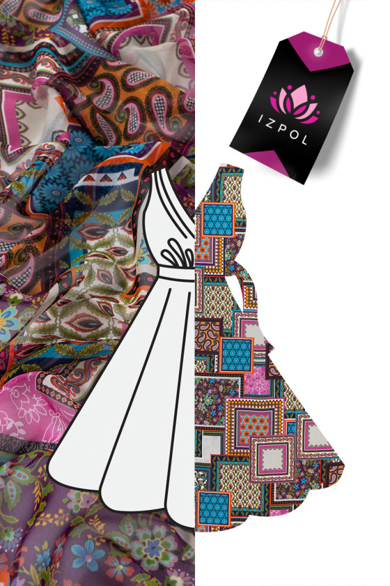 Italiensk chiffon 100% silke med et motiv af farverige firkanter - patchwork. Chiffon lavet af naturlig silke er et meget delikat, luftigt, gennemsigtigt, mat stof. Perfekt til luftige kjoler og bluser. Ikke-elastisk stof.