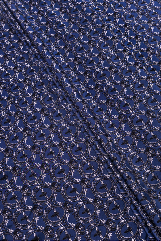 Italiensk 100% silke twill stof i marineblå med sløjfe twill motiv i krone i hvid og sort (motivet er 8 cm i størrelse). Silke twill er et stof med en twill vævning, blød, meget holdbar, forsigtigt stiv at passe.