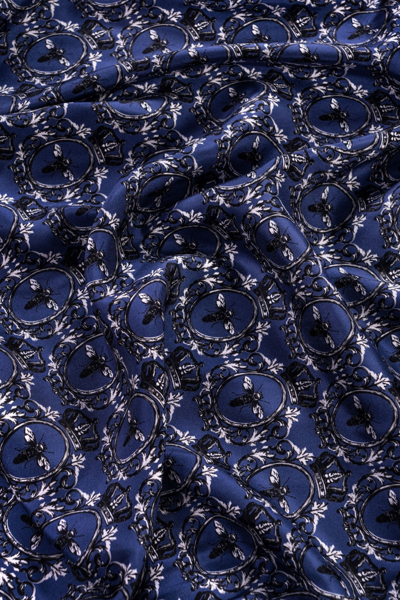 Italiensk 100% silke twill stof i marineblå med sløjfe twill motiv i krone i hvid og sort (motivet er 8 cm i størrelse). Silke twill er et stof med en twill vævning, blød, meget holdbar, forsigtigt stiv at passe. Perfekt til syning af skjorte, kjole, nederdel eller sjal/tørklæde.