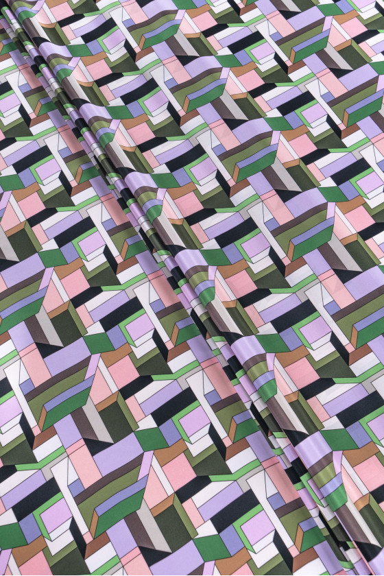 Italiensk 100% silkesatin med et geometrisk motiv i følgende farver: sort, lyng, grøn, grå og pink - trykket er lavet på en mat side. Silke satin er et tæt og let stof med en flad overflade, lavet i en satinvævning. En yderligere fordel er dens glathed og holdbarhed, samt det faktum, at det passer meget godt, ikke viser sig igennem og er behageligt at røre ved. På den ene side er den mat, og på den anden side er den ædelt skinnende. Det kan bruges til at fremtrylle luftige kjoler, sarte bluser, nederdele, tørklæder, tørklæder.