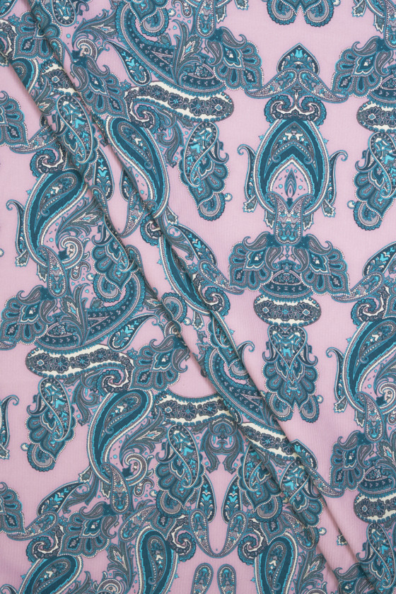 Italiensk 100% silkestof med en delikat grosgrain vævning i dirty pink med et meget populært, orientalsk paisley motiv i nuancer af havgrøn og turkis. Et ideelt forslag til folk der kan lide moderigtige mønstre i originale farver.