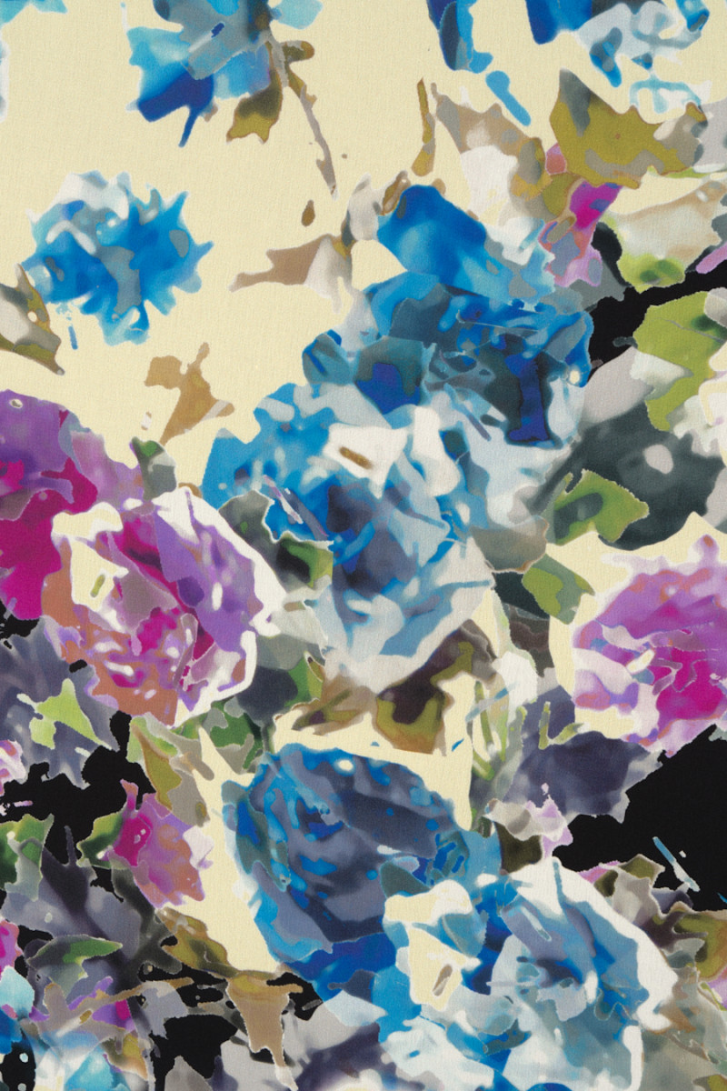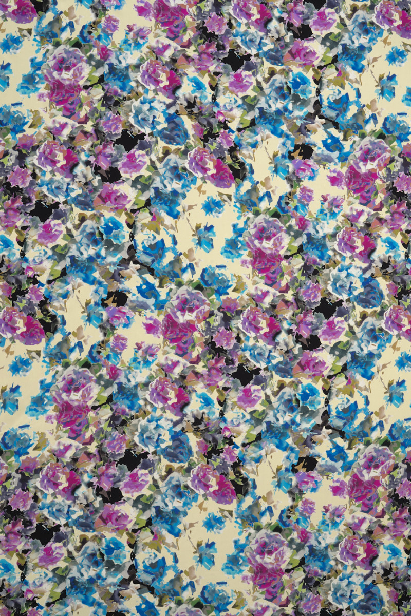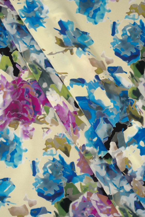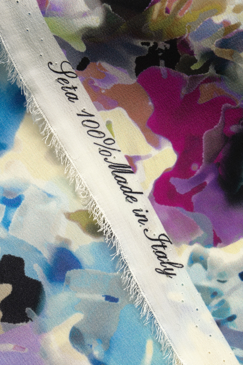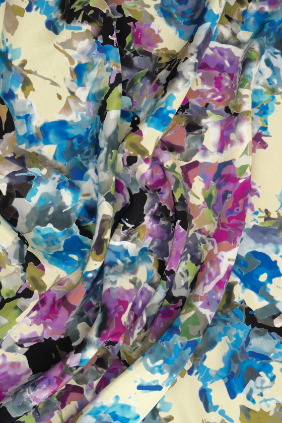 Italiensk 100% silkecrepe med et meget tæt motiv af malede blomster. Mønsteret opretholdes i et meget interessant farveskema af lilla og blå med sorte accenter. Det hele er trykt på vaniljebaggrund. Stoffet har en lidt højere grammage end klassisk silkecrepe, takket være den er mere tæt og mindre gennemsigtig. Det er perfekt til syning af en elegant bluse, kjole, nederdel eller smukt tørklæde.