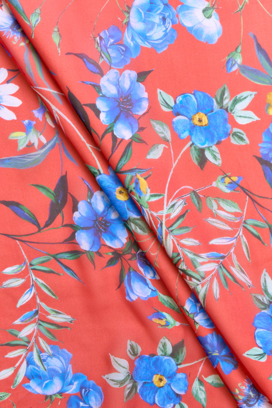 Italiensk 100% silkemuslin med et motiv af blå, gule og fløde blomster på rød baggrund, det hele suppleres med blade og stilke i dæmpede grønne nuancer. Naturlig silkemuslin er et meget delikat, luftigt, gennemsigtigt stof med en delikat glans, der er karakteristisk for silkestoffer. Perfekt til lette kjoler, bluser eller nederdele.