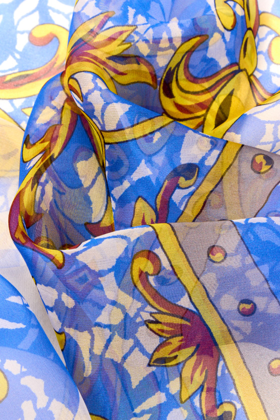 Italiensk muslin 100% silke i blå og cremefarvede farver med gulbrune ornamenter og kæder. Midten af kuponen er dekoreret med et våbenskjold med løver og en krone, siderne med lommeurmønstre. Stoffet kommer i kuponer med dimensioner på 130cm * 135cm. Naturlig silkemuslin er et meget delikat, luftigt, gennemsigtigt stof med en delikat glans, der er karakteristisk for silkestoffer. Perfekt til lette kjoler, bluser, nederdele eller tørklæder.