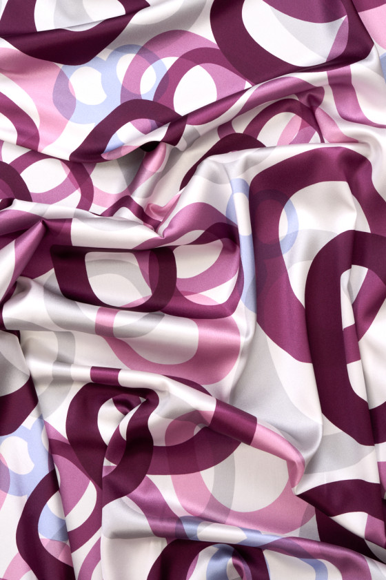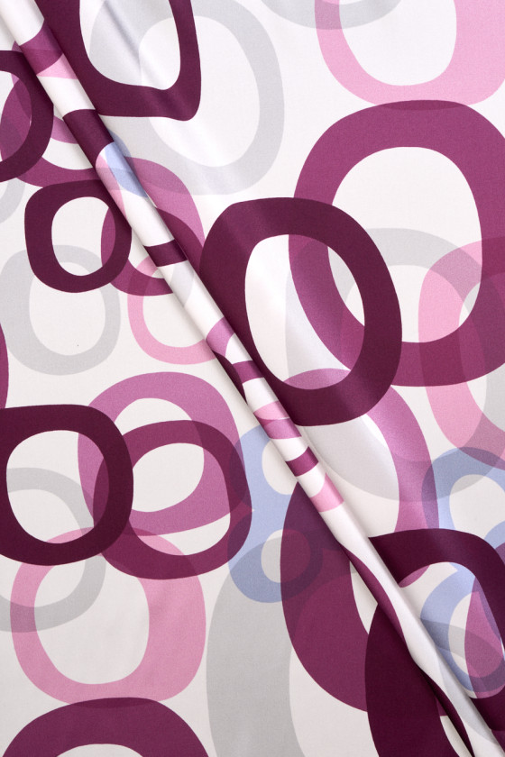 Italiensk silkesatin med tilsætning af elastan med et motiv af uregelmæssige cirkler i rødbeder, lyserød og grå på hvid baggrund. Stoffet er elastisk, flydende, delikat at røre ved, blødt og uigennemsigtigt. Tilsætningen af elastan gør det mere behageligt at have på og rynker mindre. Tæt placerede geometriske mønstre i forskellige størrelser, den største cirkel er 19 cm * 20 cm, den mindste 6 cm * 6 cm. Et interessant forslag til at skabe en original skjorte, kjole eller nederdel.