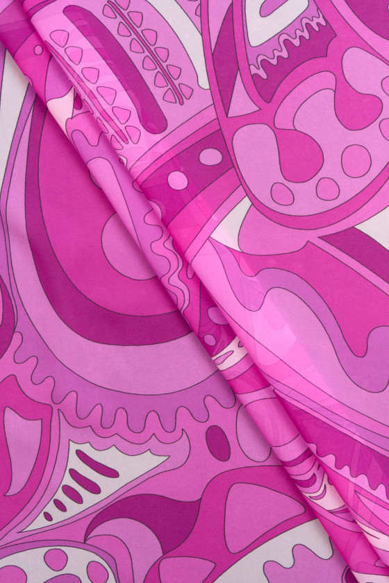 Italiensk chiffon 100% silke med flotte mønstre i intense lyserøde og cremefarvede farver. Stoffet er meget delikat, behageligt at røre ved, let gennemsigtigt, flydende. Et motiv, der er karakteristisk for en velkendt modedesigner. Et interessant forslag, hvorfra du kan fremtrylle en unik kjole, nederdel eller bluse.