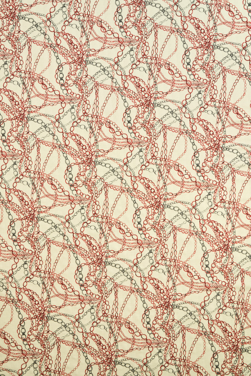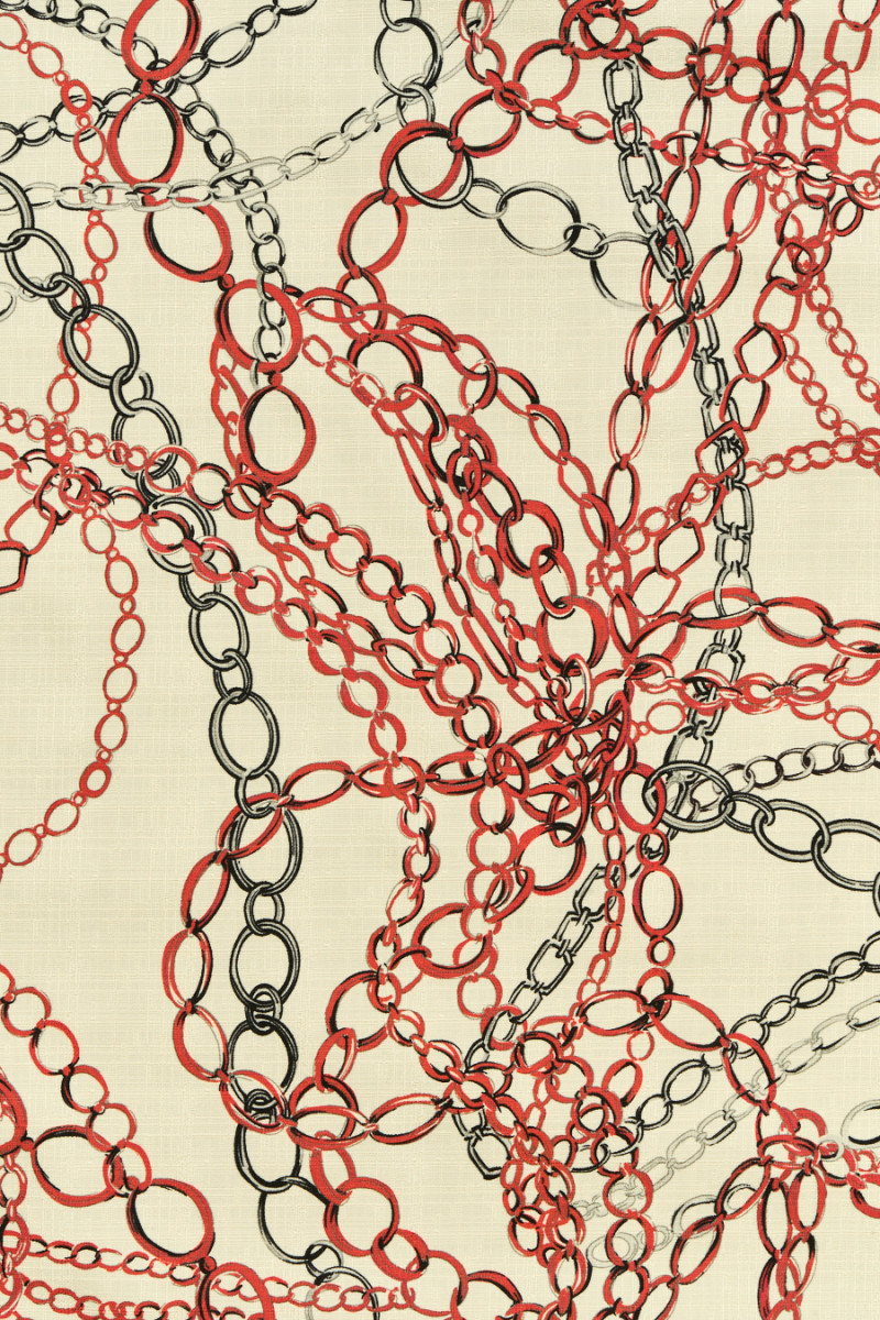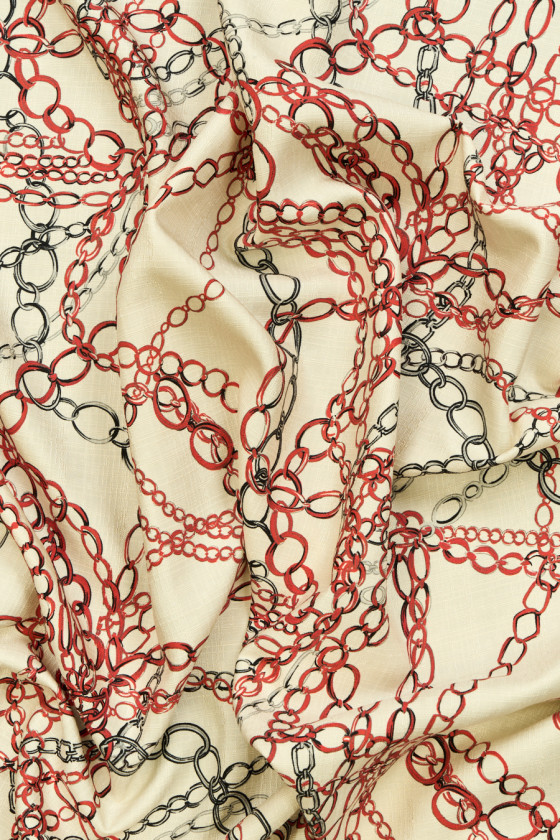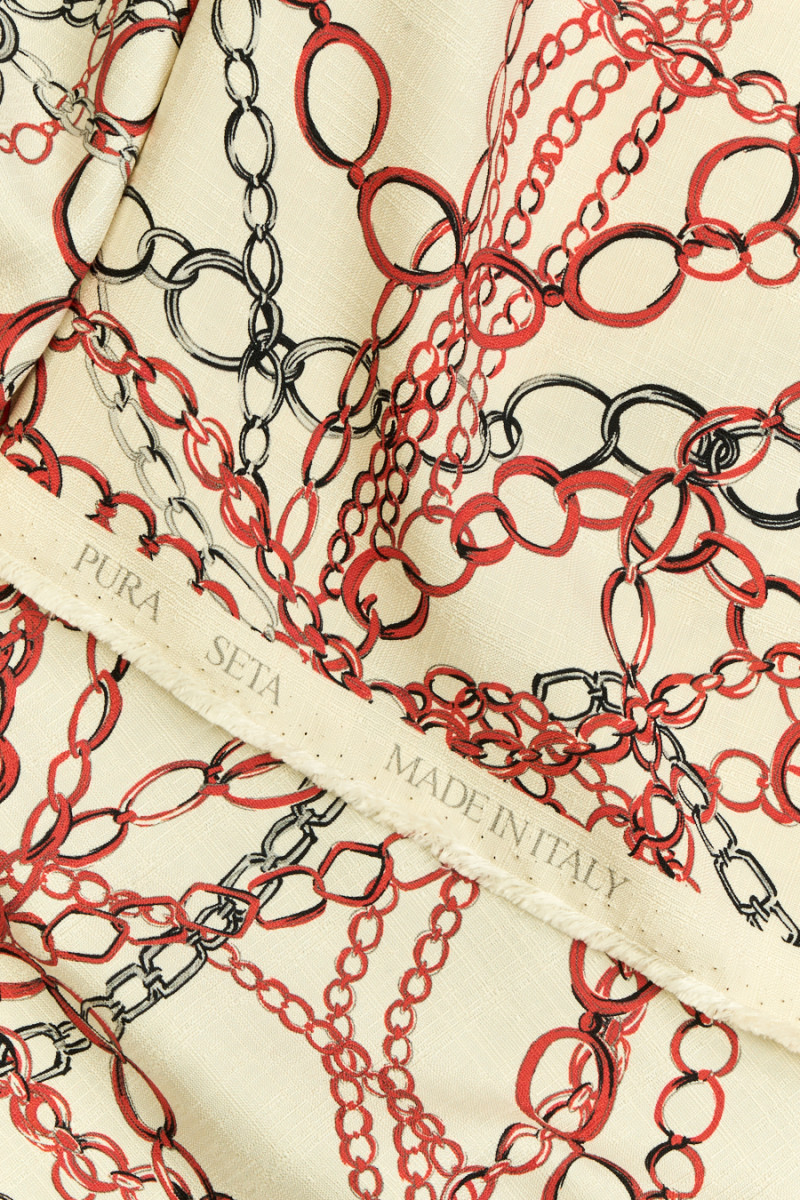 Italiensk 100% silkestof med et motiv af røde og stålkæder på en ecru baggrund. Stoffet er let, tyndt, men uigennemsigtigt, uelastisk, lidt stift at passe, med en struktur, der ligner en linnedvævning. Et godt forslag, hvorfra du kan oprette skjorter, shorts, bluse eller kjole.