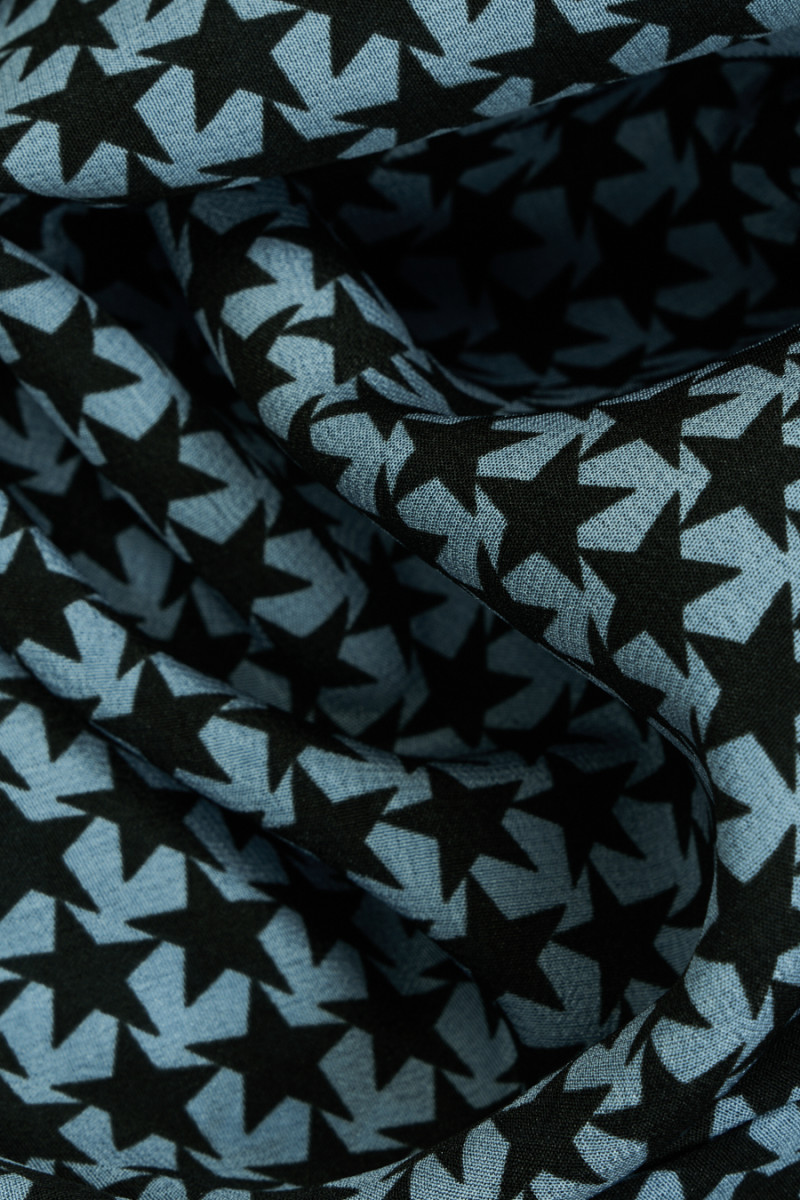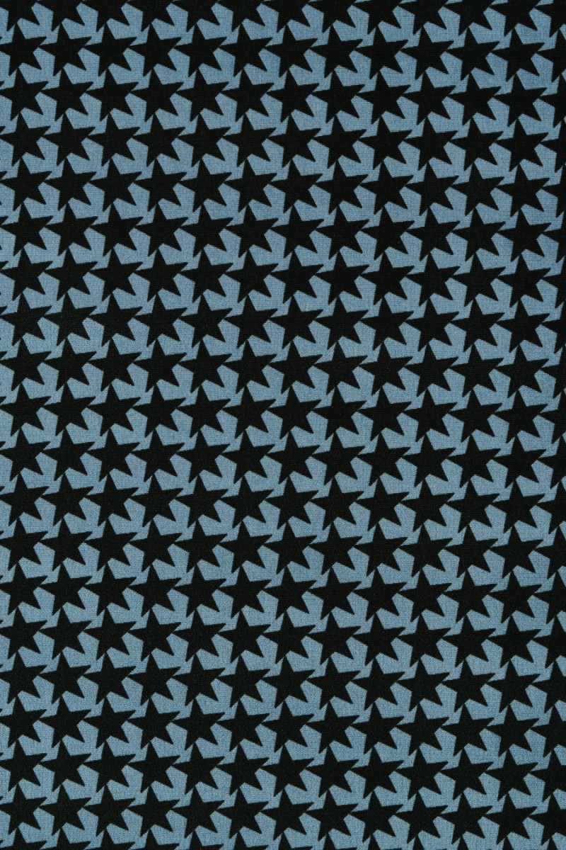 Italiensk 100% silke crepe med et motiv af små sorte stjerner på blå baggrund. Regelmæssigt og tæt design, hvor en stjerne er 1,4 cm*1,4 cm. Stoffet er let, tyndt, ikke-elastisk, mat og blødt draperet. Perfekt til bluser, skjorter og luftige kjoler og nederdele.