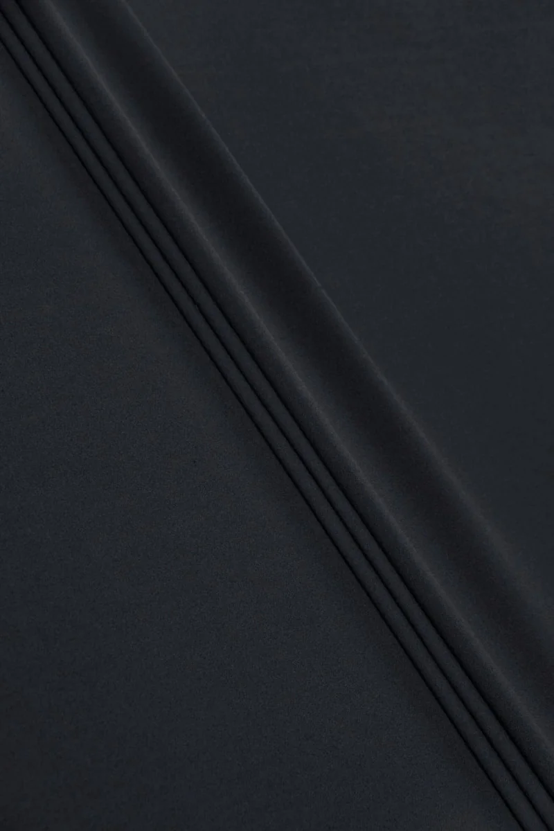 Italiensk, tyndt georgette vævet stof i en meget mørk marineblå farve - næsten sort. Stoffet er tyndt, men uigennemsigtigt, uelastisk, tungt. Den er perfekt til at sy en elegant bluse, kjole eller nederdel.