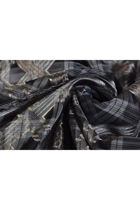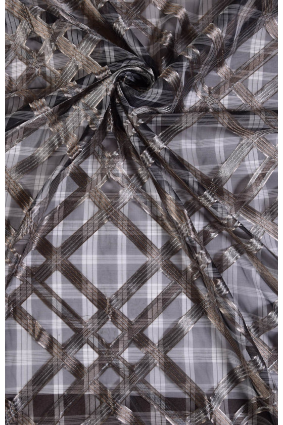Organza-stof med et moderigtigt ternet mønster, vævet af viskose og silke. En smuk, klassisk kombination af farver: beige, sort og grå. Dens struktur er let stiv, gennemskinnelig. Vi anbefaler at sy nederdele, kjoler, formelle skjorter eller bruge det som et dekorativt stof.