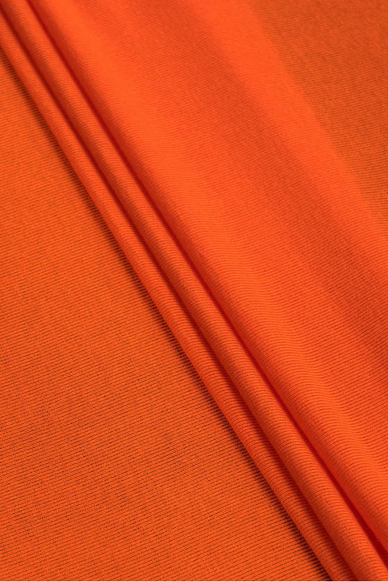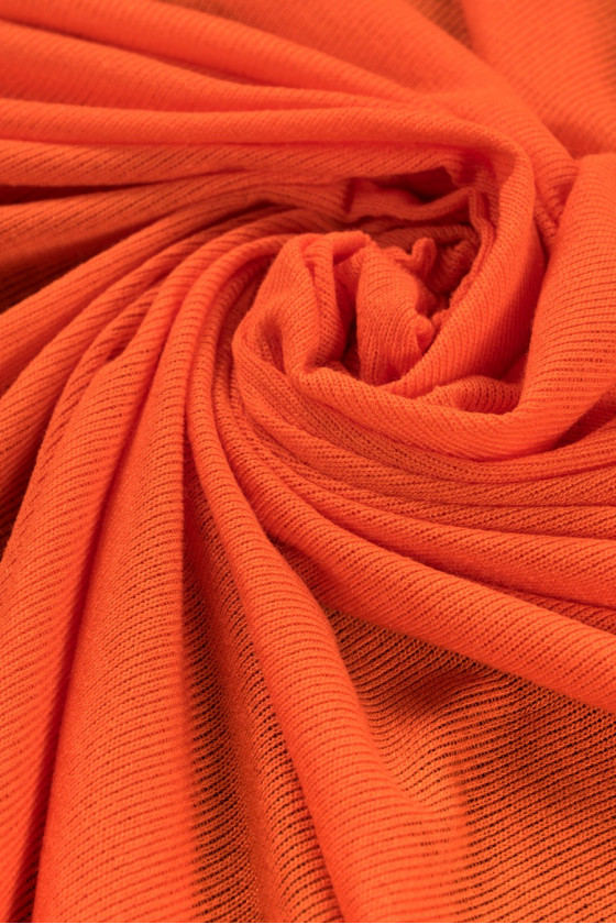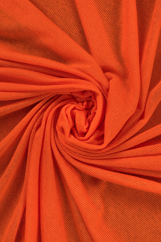 Italiensk sweater strikket stof af meget god kvalitet. Stoffet er tyndt, elastisk, let gennemsigtigt. Perfekt til at sy en let sweater eller bluse. Farver: orange