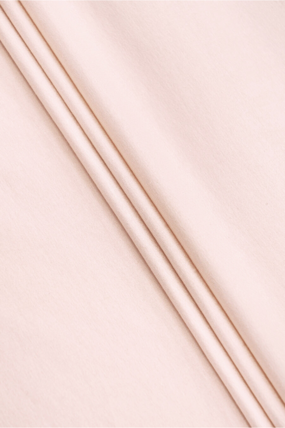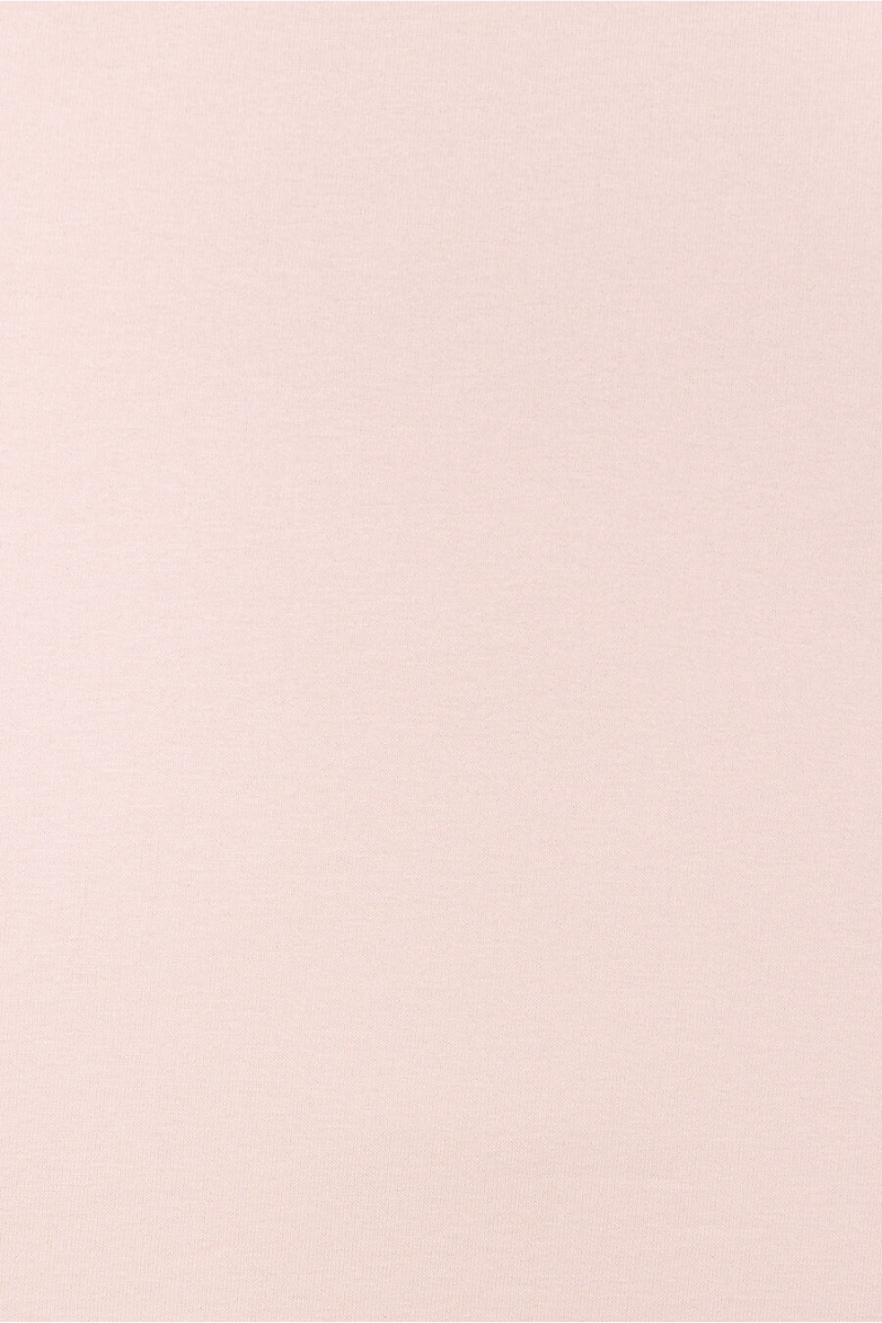 Kompakt, elastisk strikket stof i lyserød farve. Består af: 70% viskose, 24% polyester, 6% elastan. Vægten af det strikkede stof er 220g/m2
