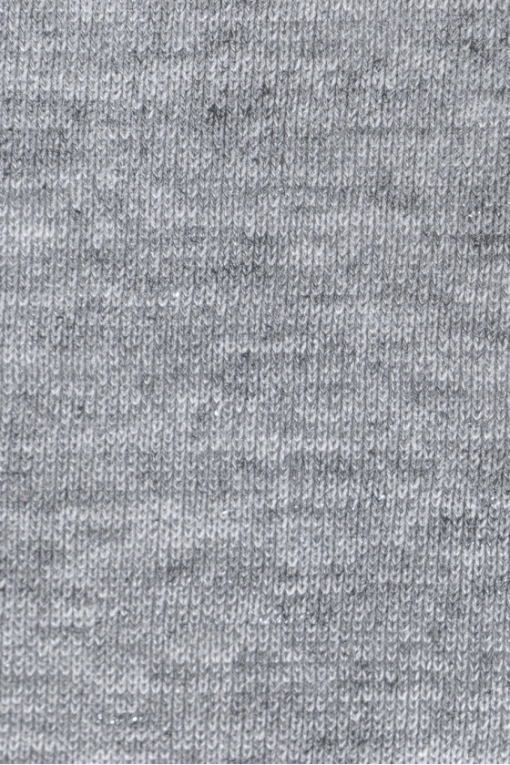 Italiensk viskose strikket stof i grå (melange) med sølv lurex tråd - meget god kvalitet. Tynd, fleksibel med en let glans. Perfekt til at sy en bluse eller t-shirt.