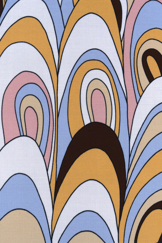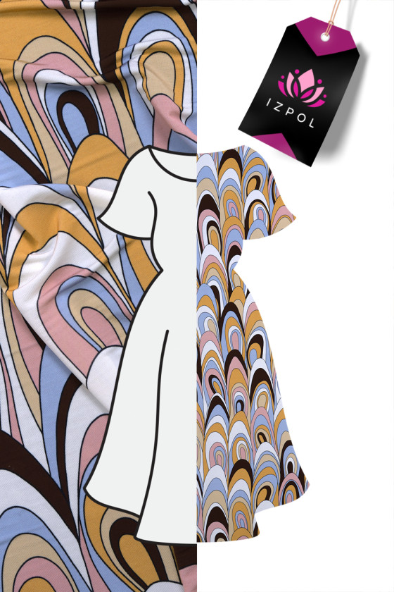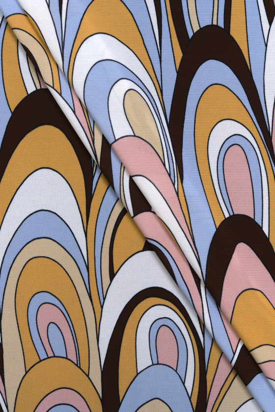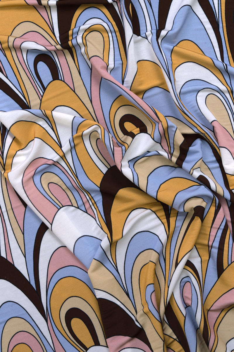Italiensk viskose strik. Geometrisk mønster i brune, lyserøde og beige farver. Elastisk strikket stof i begge retninger, tungt, glat af køletypen - perfekt til syning af en sommerbluse, kjole eller nederdel.
