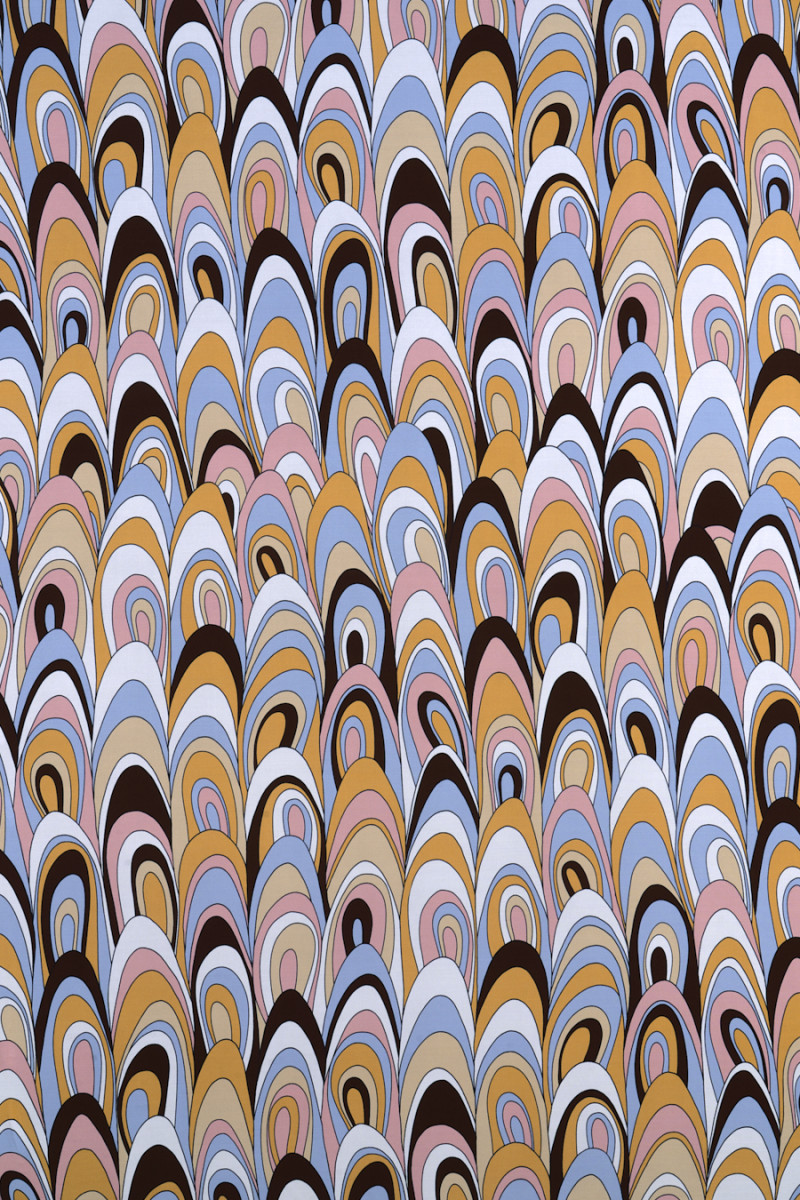 Italiensk viskose strik. Geometrisk mønster i brune, lyserøde og beige farver. Elastisk strikket stof i begge retninger, tungt, glat af kølende slags.
