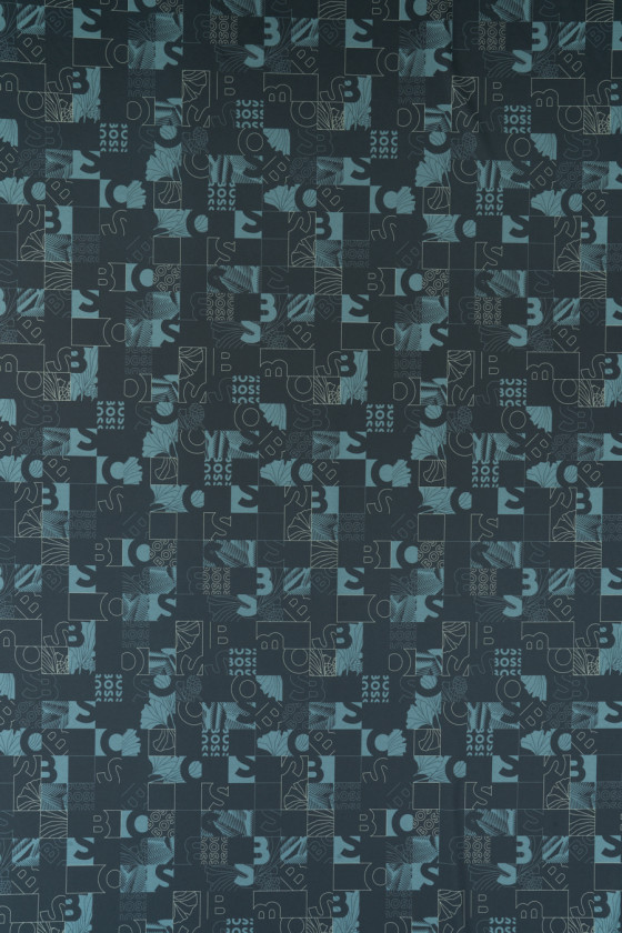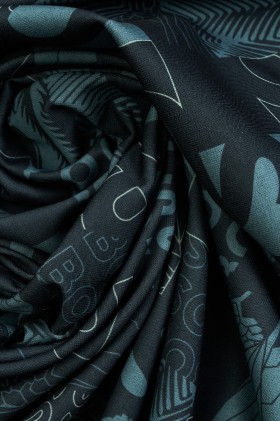Italiensk viskose jerseystof med et motiv af inskriptioner og bogstaver placeret i firkanter. Det hele holdes i rolige farver - grafit, gråblå. Firkanterne har en størrelse på 5 cm * 5 cm, hver af dem har et mønster placeret - bogstaver, blade, streger. Det strikkede stof er uigennemsigtigt med en tæt vævning, elastisk, blødt draperet og kødfuldt. Perfekt til bukser, jakker, sweatshirts.