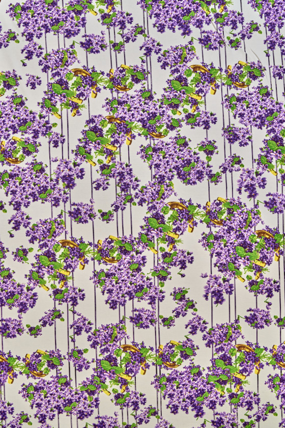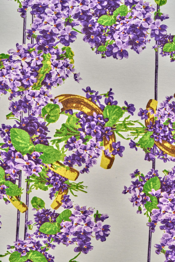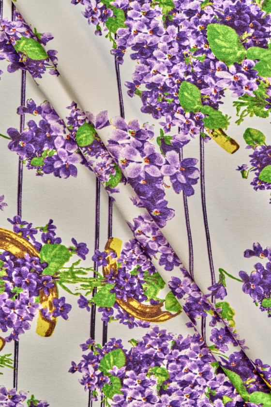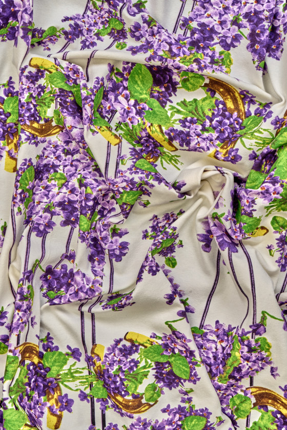 Italiensk viskosejersey strikket stof med et motiv af små, lilla blomster, gyldne hestesko og striber på en cremefarvet baggrund. Mønsteret er tæt, og blomsterne danner buketter dekoreret med grønne blade. Det strikkede stof er uigennemsigtigt med en tæt vævning, elastisk, blødt draperet og kødfuldt. Perfekt til kjoler, bukser, jakker og sweatshirts.
