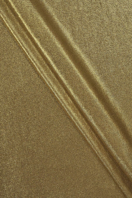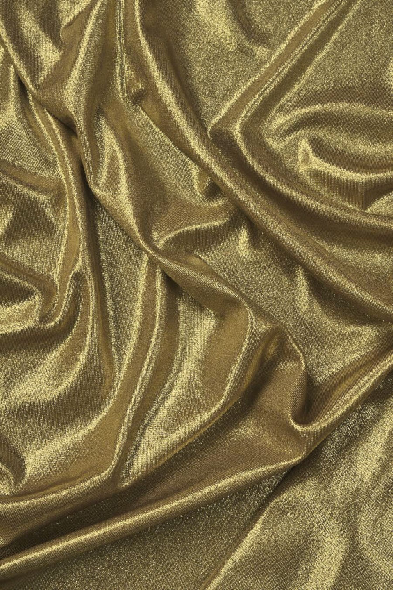 Italiensk strikket stof i sort med en stærk og tæt gylden glød (det er ikke glitter, det falder ikke af). Det strikkede stof er tyndt, men uigennemsigtigt, elastisk, let og flydende. Et interessant forslag til bluser, toppe og formelle kjoler.