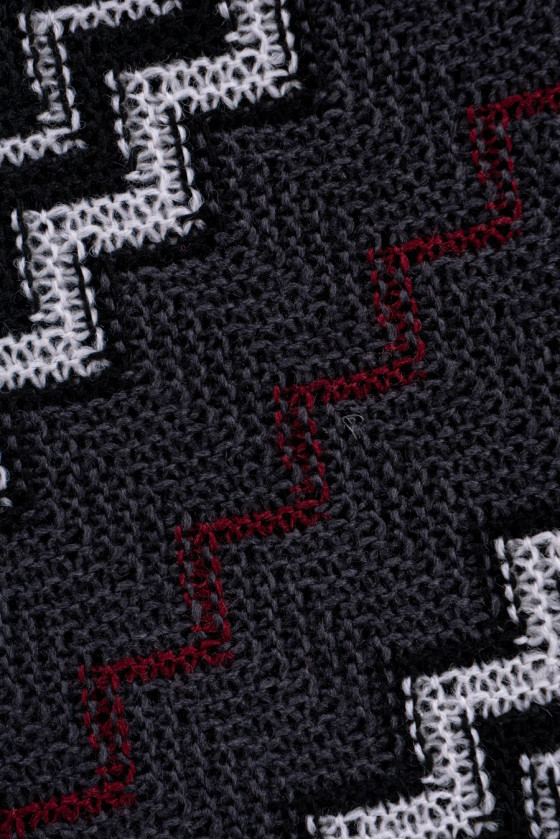 Italiensk sweater strikket med en løs vævning, vævet af naturlig uld med akryl. Et karakteristisk motiv af farverige zigzags fra det velkendte modehus. Stoffet er perfekt til syning af en sweater, cardigan, vest, poncho, sjal.