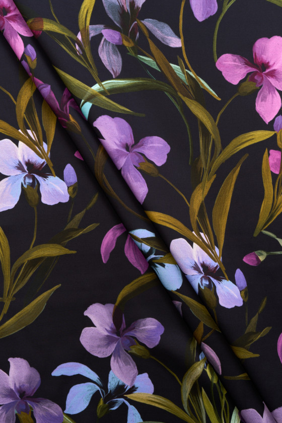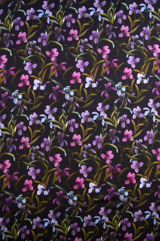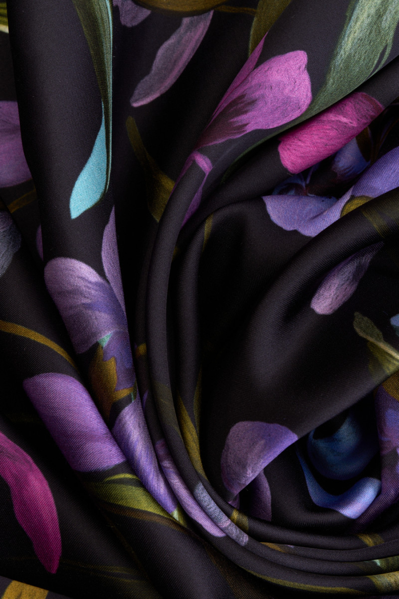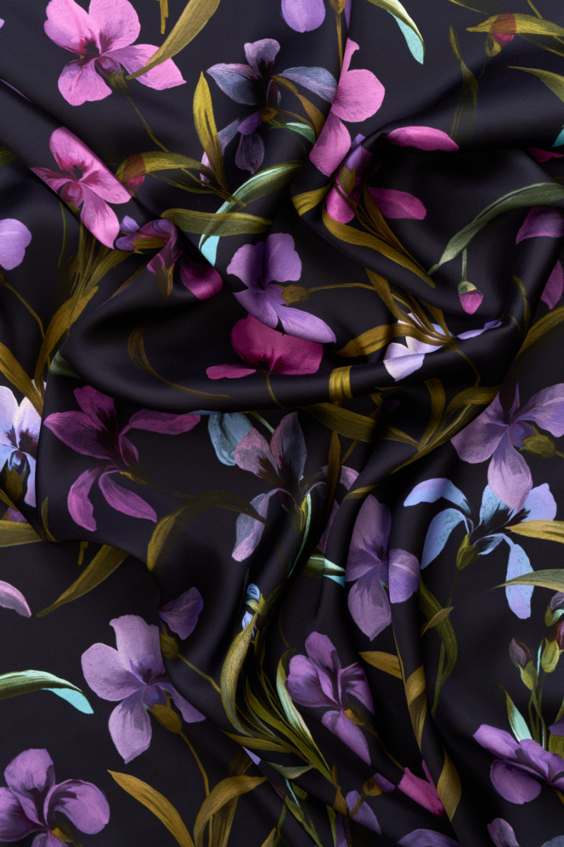 Italiensk viskose satin med et motiv af farverige blomster og aflange blade på sort baggrund. Tæt placeret blomstermønster lavet i nuancer af lilla, fuchsia og grøn, blomster omkring 7 cm * 7 cm i størrelse. Stoffet er ikke-elastisk, flydende, delikat at røre ved, blødt og passer smukt. Et fantastisk forslag til folk, der leder efter unikke og interessante materialer til skjorter, nederdele, kjoler eller tørklæder.