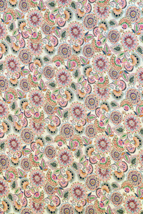 Italiensk stof 100% viskose med et motiv af folklore blomster på en creme baggrund. Mønsteret er tæt, farverigt, mellemstort. Stoffet er tyndt, let gennemsigtigt, mat, flydende og let, samt køligt og lidt groft i berøring. Et godt forslag til luftige kjoler, nederdele og bluser.